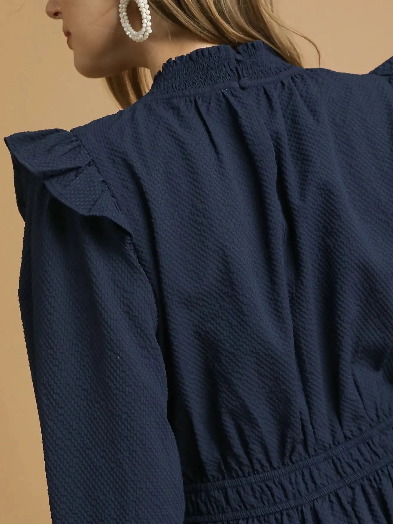 Add a touch of timeless elegance with the Ruffle Charm Textured Midi Dress with Ruffles. Crafted from textured navy fabric, this midi dress features delicate ruffle shoulder details that bring a feminine and whimsical flair. The midi length creates a refined silhouette, perfect for both casual and dressy occasions. Effortlessly chic, this dress pairs beautifully with heels or flats, making it a versatile statement piece for your wardrobe.