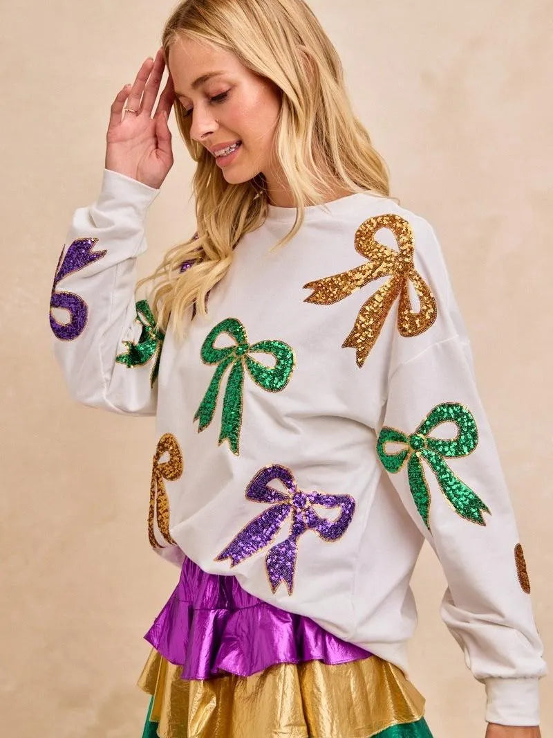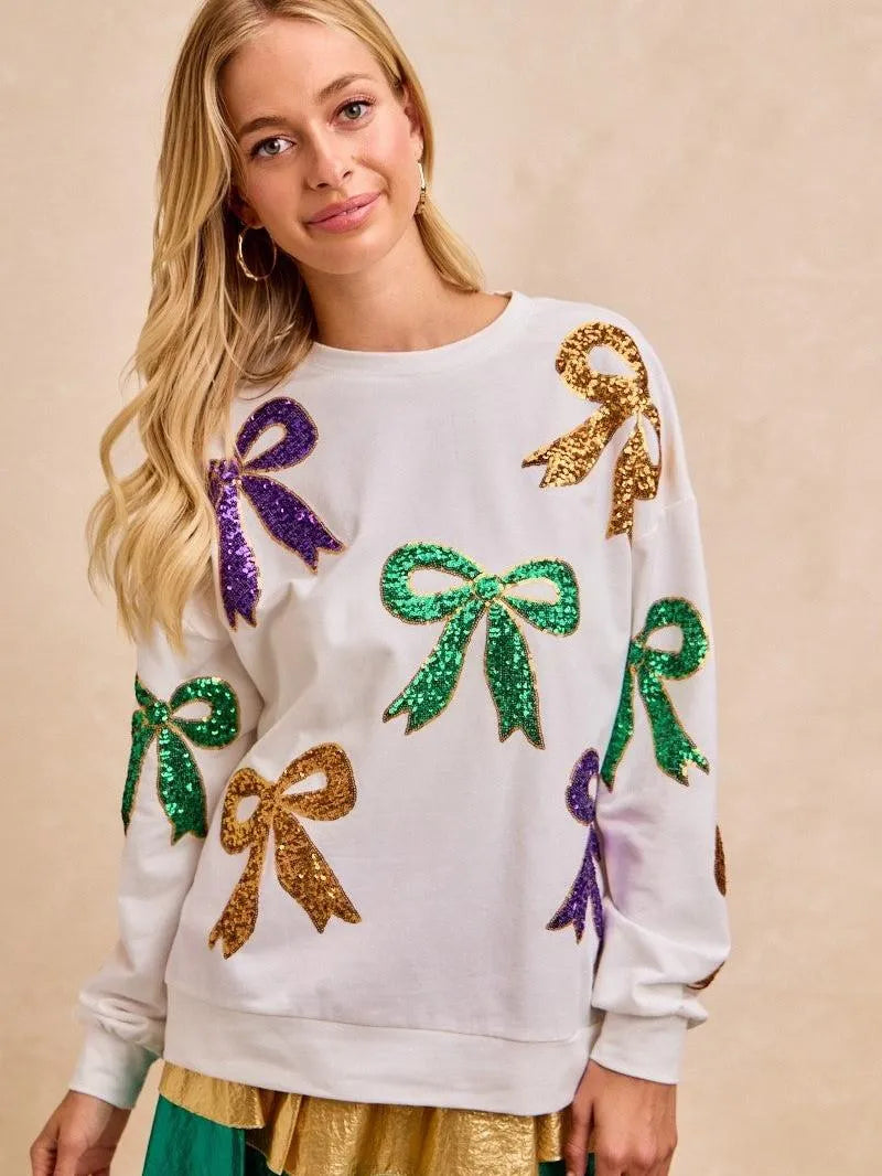 The Sparkle & Bows Mardi Gras Sequin Sweatshirt by BiBi adds a playful shimmer to your everyday wardrobe. Made from 100% soft cotton, this cozy sweatshirt features a classic crew neckline and long sleeves with a relaxed fit for all-day comfort.