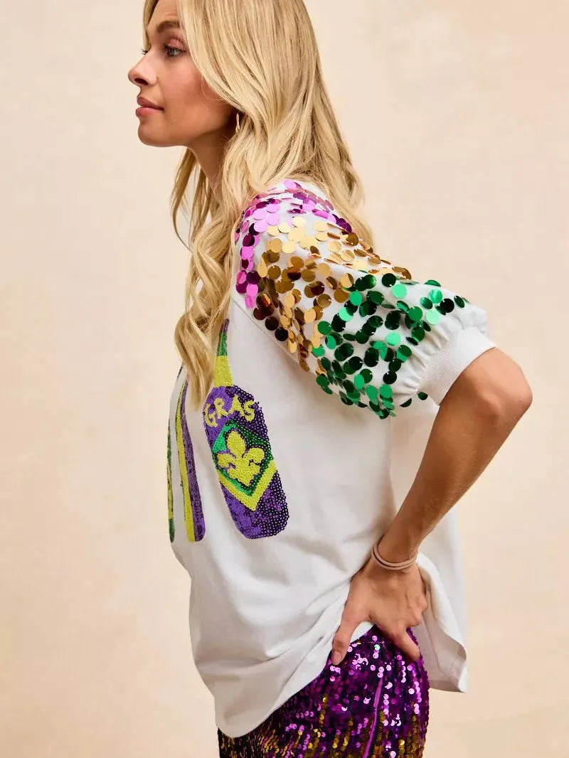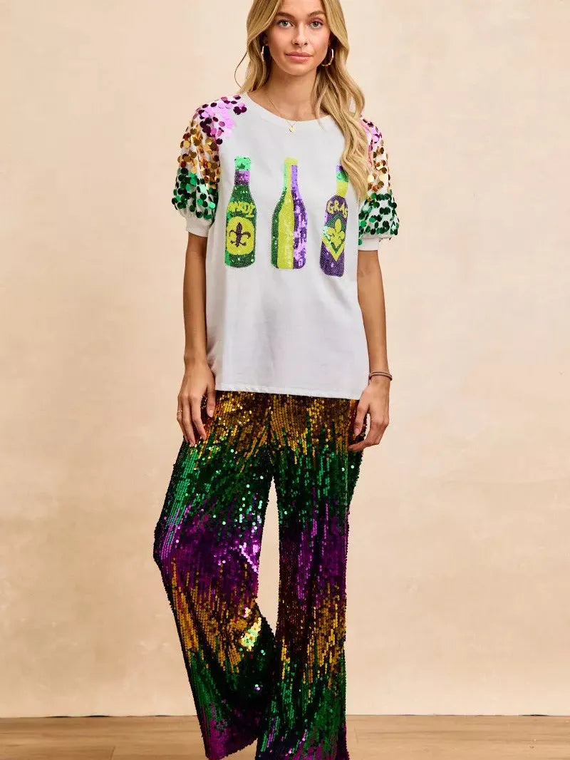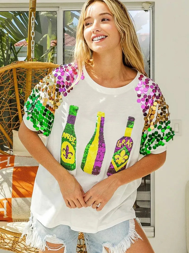 The Mardi Gras Magic Sequin Bottle Spangled Sleeve Top is a bold and festive statement piece made to shine. Featuring playful sequin Mardi Gras bottle detailing, this top brings colorful charm and celebration-ready style. The spangled sleeves add glamorous sparkle, making it perfect for parties, special occasions, or a fun night out. Crafted from comfortable fabric, it offers easy wearability while delivering standout flair. This dazzling top is made for turning heads and celebrating in style.