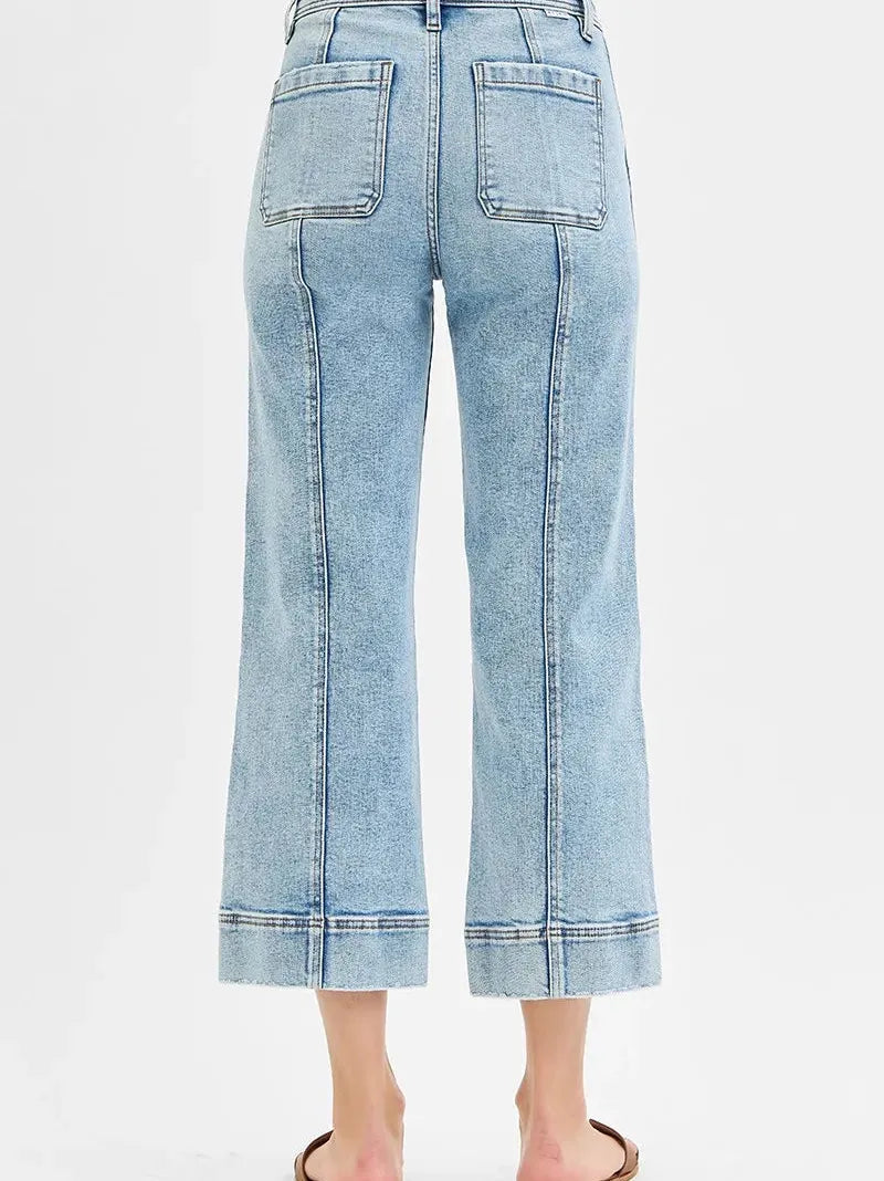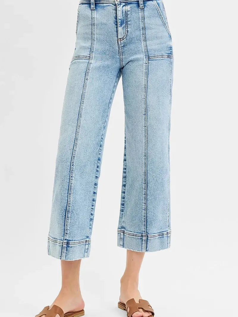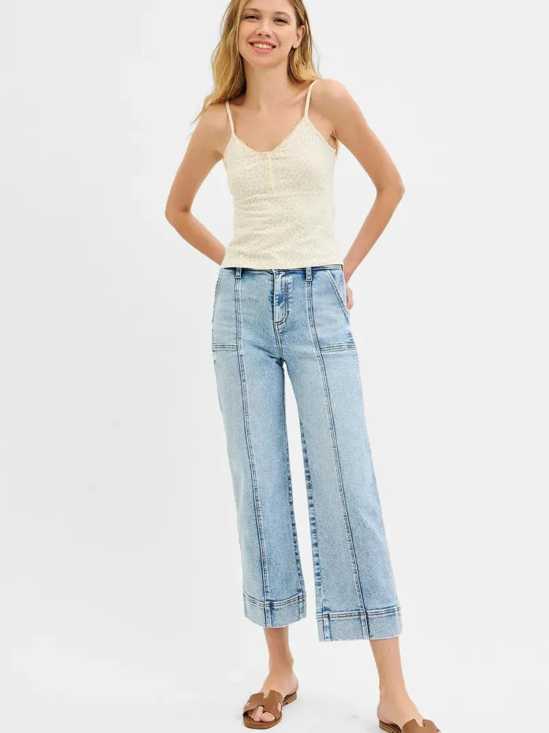 Step up your denim game with the Risen Moonwashed Blue High Rise Crop Wide Leg Jeans, designed to flatter your shape and bring fresh, modern energy to your wardrobe.
