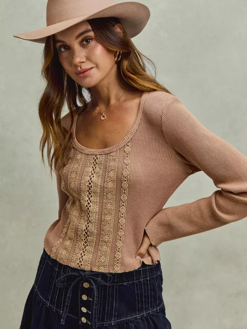 Sweet meets vintage in the Latte Lace Revival Vintage Wash Lace Long Sleeve Crop Knit Top, a romantic essential with effortlessly cool charm. Crafted from 100% cotton thermal knit, this cropped top features a soft vintage wash that gives it a perfectly lived-in feel. Delicate lace detailing adds a feminine, heirloom-inspired touch, while the cropped silhouette pairs beautifully with high-waisted denim, skirts, or layered looks. Breathable, lightweight, and endlessly versatile, this top blends retro inspiration with modern styling for an elevated everyday piece.