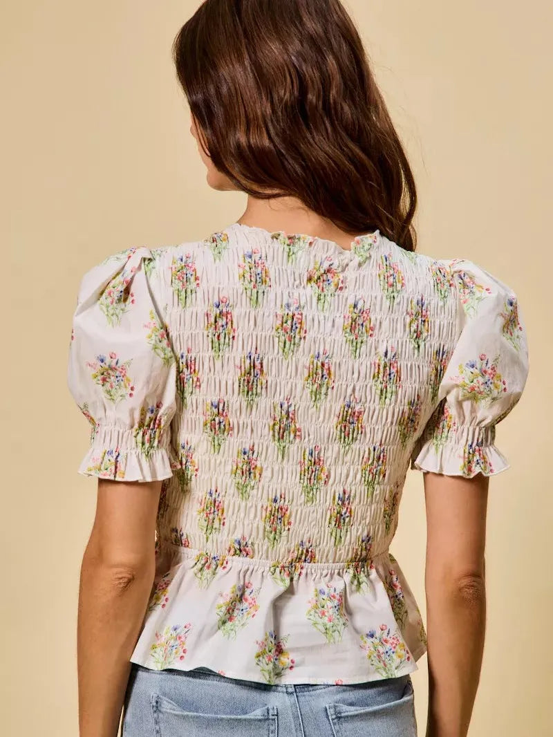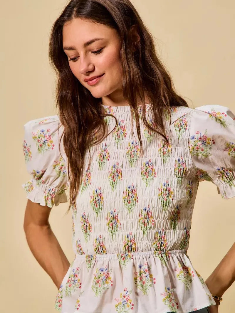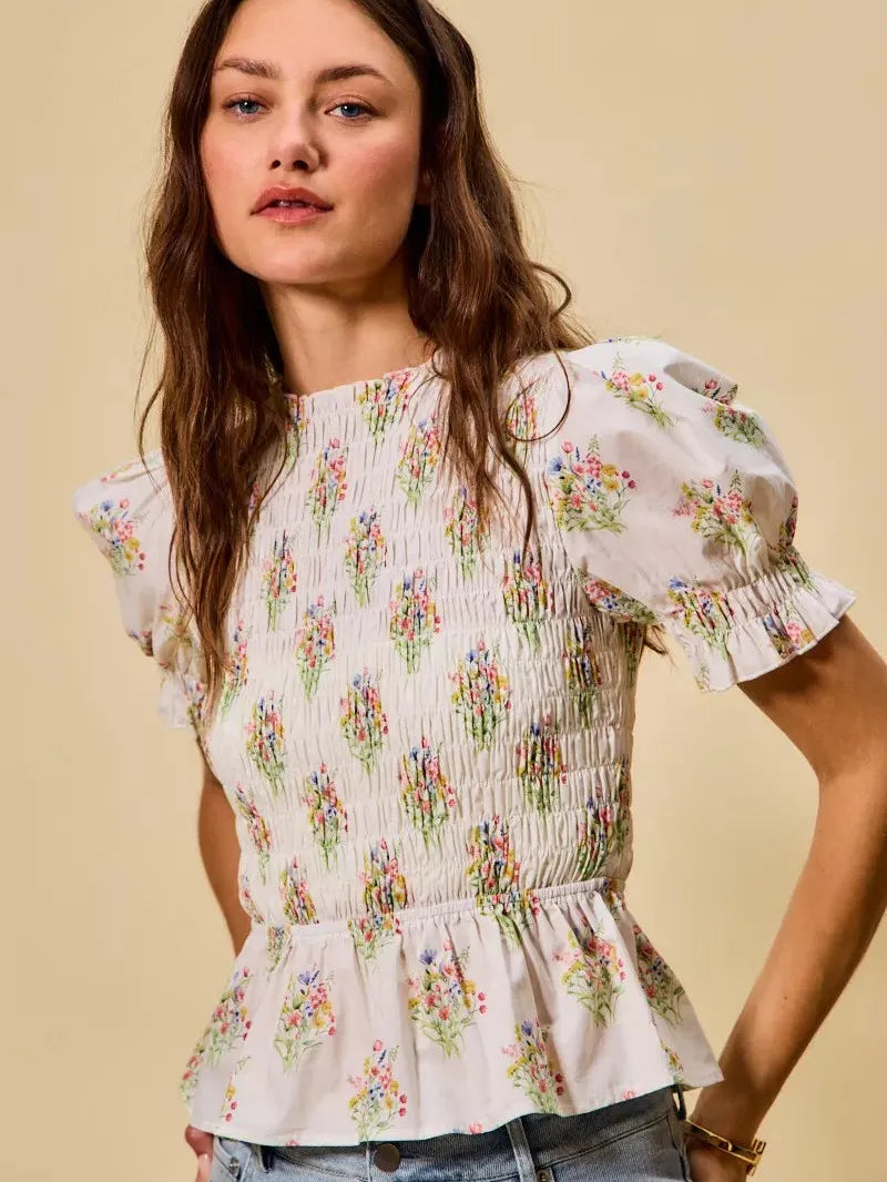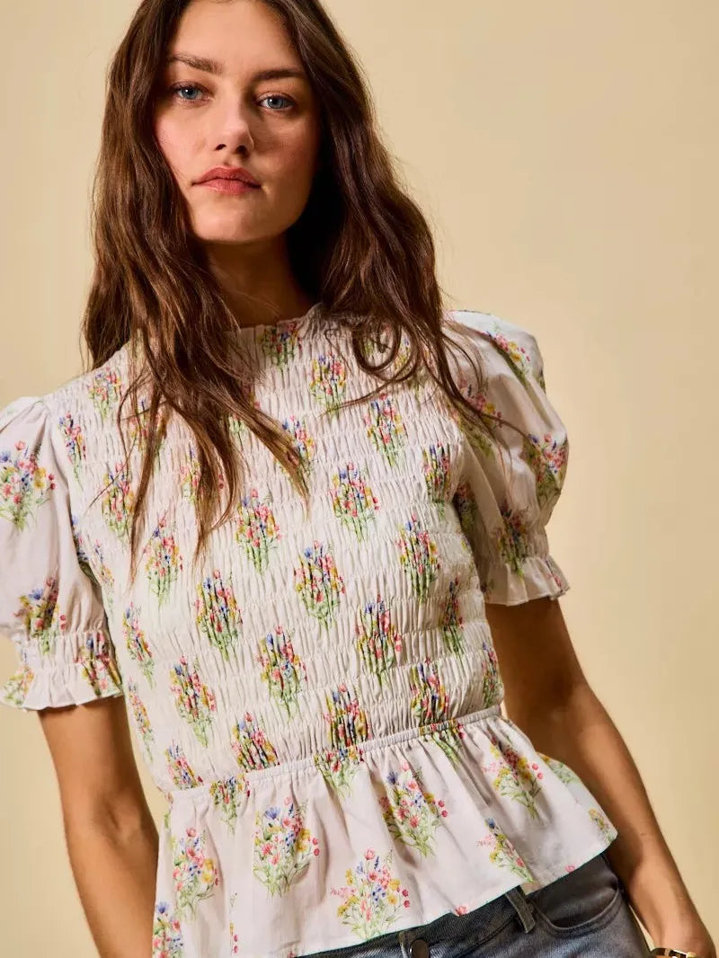 The Bloomsoft Beauty Smocked  Short Sleeve Peplum Blouse is a timeless piece designed for effortless femininity. Made from lightweight, breathable 100% cotton, this blouse features a delicate floral print on an ivory base for a fresh, romantic look. The smocked bodice creates a flattering and comfortable fit, while the short sleeves keep it airy and perfect for warm-weather days. Easy to dress up or down, this versatile top pairs beautifully with denim, skirts, or tailored trousers for a polished yet relaxed ensemble.