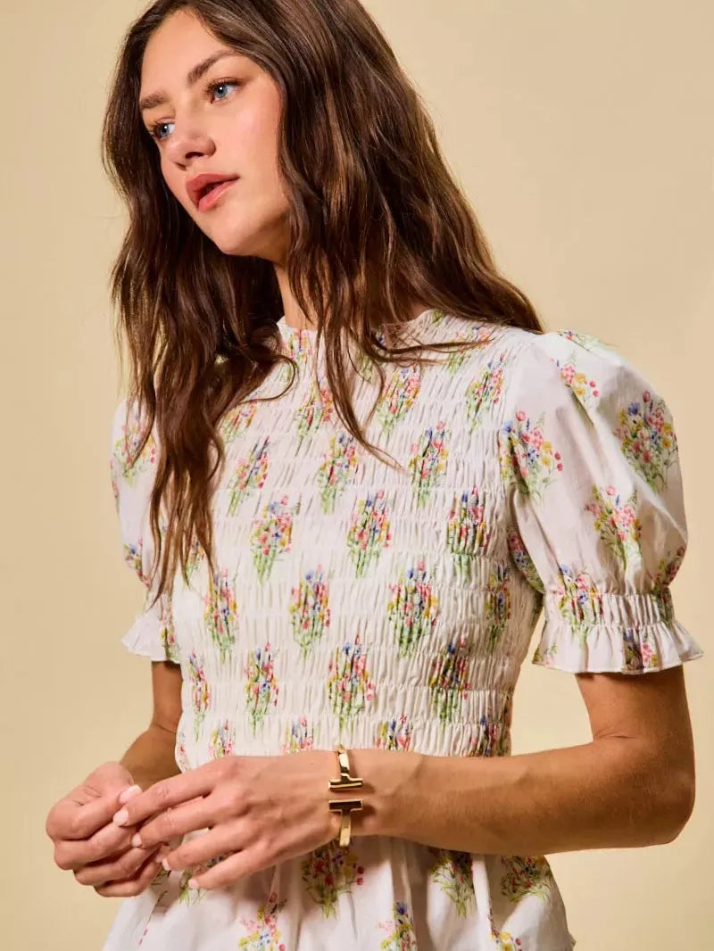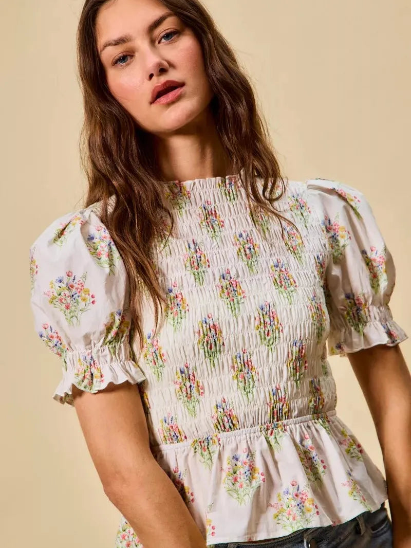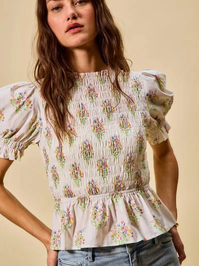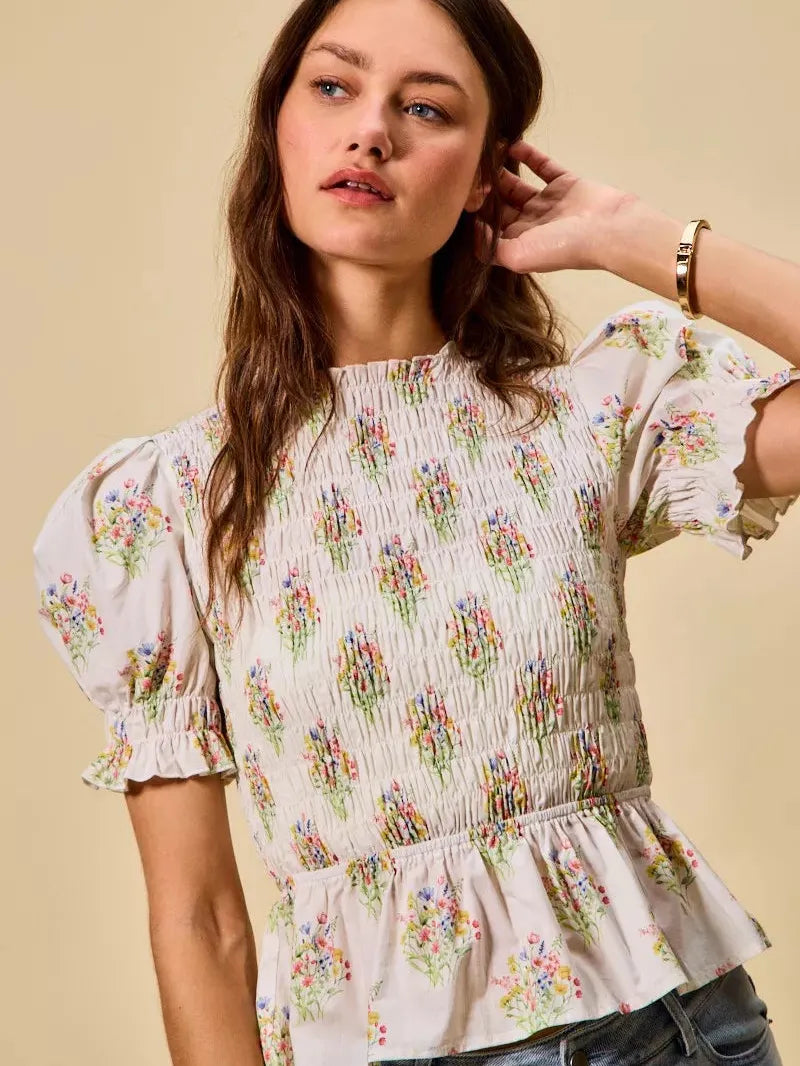 The Bloomsoft Beauty Smocked  Short Sleeve Peplum Blouse is a timeless piece designed for effortless femininity. Made from lightweight, breathable 100% cotton, this blouse features a delicate floral print on an ivory base for a fresh, romantic look. The smocked bodice creates a flattering and comfortable fit, while the short sleeves keep it airy and perfect for warm-weather days. Easy to dress up or down, this versatile top pairs beautifully with denim, skirts, or tailored trousers for a polished yet relaxed ensemble.