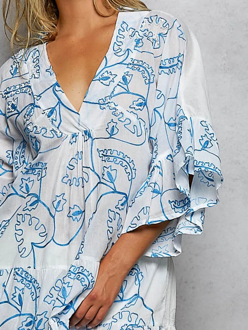 Designed with ruffle sleeves and a flattering V-neckline, it creates a playful, graceful silhouette. Crafted from 100% lightweight cotton, the dress ensures comfort and breathability for sunny days and outdoor activities.