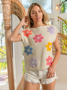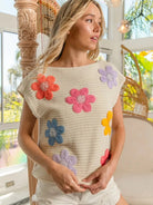 Add a playful pop to your wardrobe with the BiBi Boho Bloom Crochet Flower Jeweled Vest Top. This sleeveless ribbed knit vest features colorful floral embroidery and jeweled accents throughout for a vibrant bohemian touch. Lightweight and breathable, it offers a relaxed fit and elegant boat neckline—perfect for layering or wearing solo through spring and summer. Style it for anything from music festivals to casual weekends and beyond.